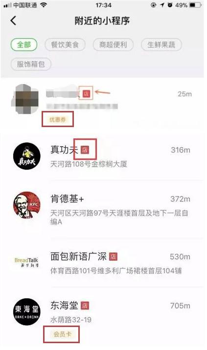 在附近的小程序里,可以看到不少小程序后面有一個(gè)紅“ 店 ”標(biāo)識。這是“門店小程序”的標(biāo)識。